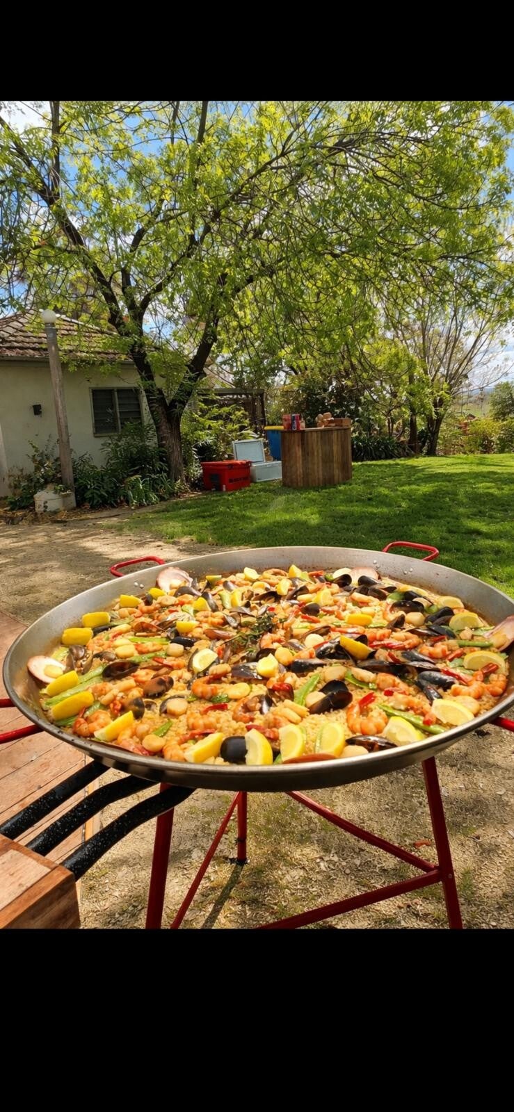 Poele a paela jusqu a 50 pers sur trépier 60€ sans bouteille de gaz le weekend et 80€ avec bouteille de gaz le weekend